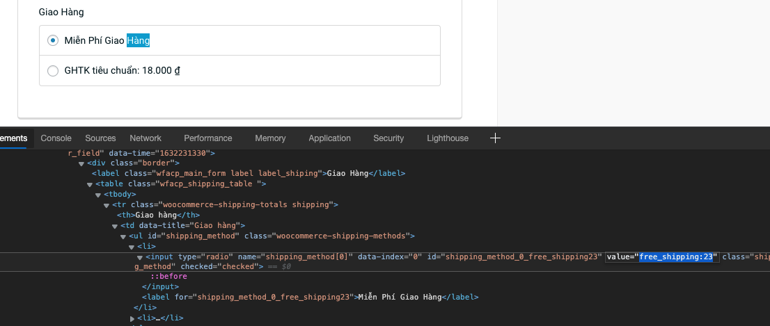 Để tìm đúng id của phương thức giao hàng, kiểm tra bằng cách truy cập vào trang thanh toán, mở Inspect panel và tìm giá trị value của phương thức giao hàng cần thiết lập.