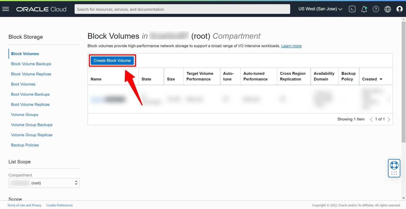 Bấm vào nút Create Block Volume để tạo phân vùng lưu trữ mới