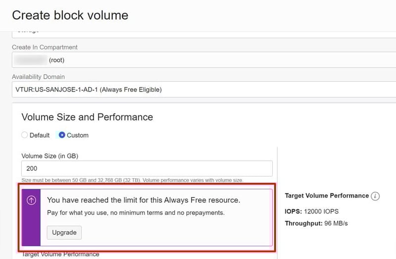 Dung lượng mặc định của Block Volume là 50GB. Bạn có thể chọn Custom và nhập vào dung lượng (GB) theo ý muốn.