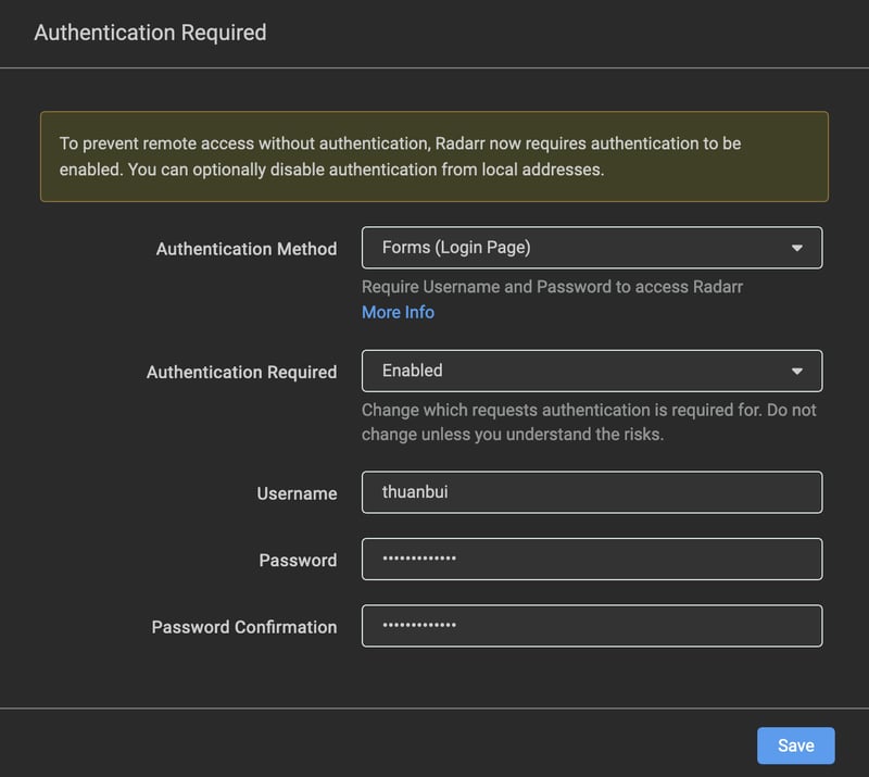 Ở lần truy cập đầu tiên, Radarr sẽ yêu cầu cấu hình bảo mật. Mình chọn cách đăng nhập bằng Login Page sau đó bấm Save.