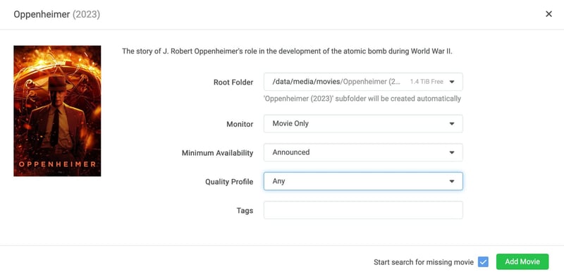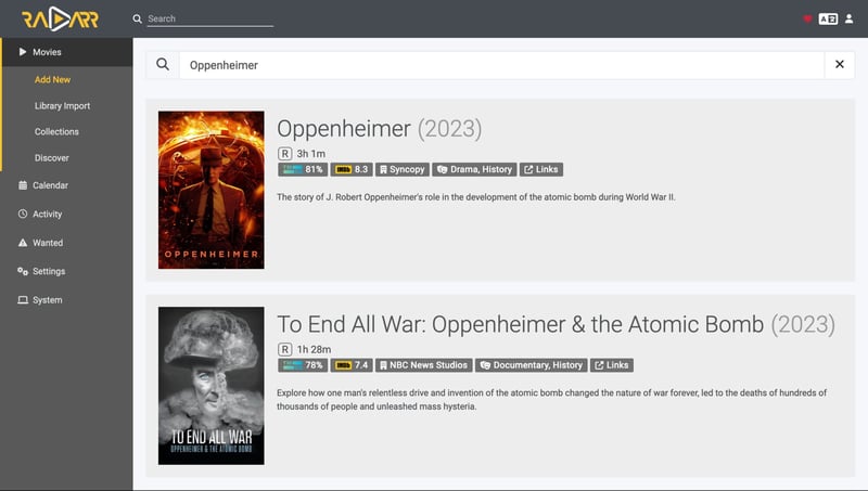 Vào mục Add New trên Radarr để tìm tên phim, ví dụ Oppenheimer