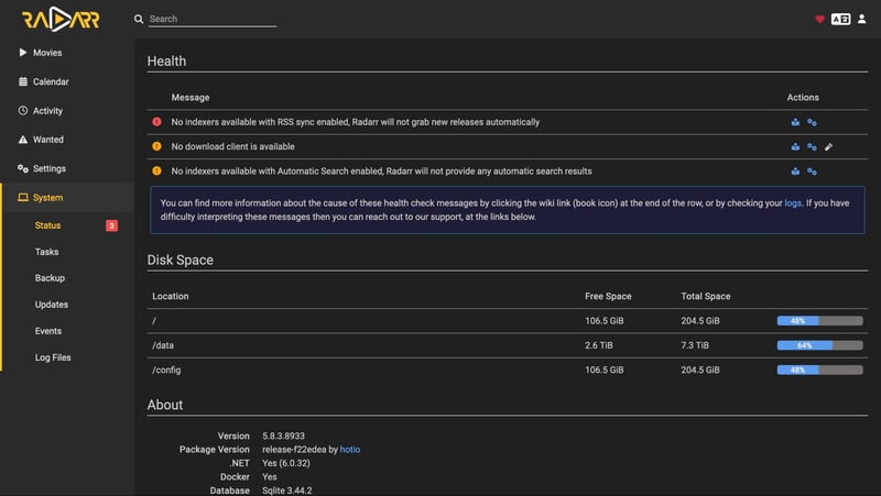 Truy cập vào Radarr ở địa chỉ http://<IP>:7878
