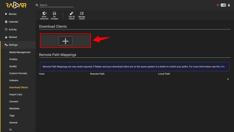 Truy cập vào phần Settings > Download Clients, bấm vào dấu + để thêm mới