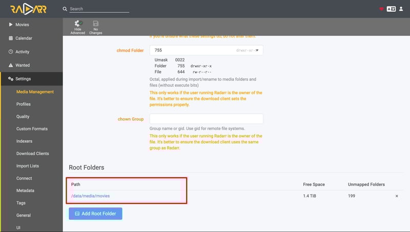 Truy cập vào mục Setings > Media Management, kéo xuống dưới cùng, bấm Add Root Folder và thêm vào thư mục /data/meda/movies