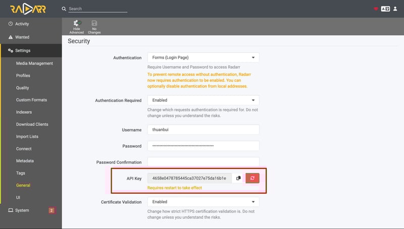Quay lại Radarr, truy cập vào mục Settings > General và kéo đến mục API Key để copy sẵn key này.