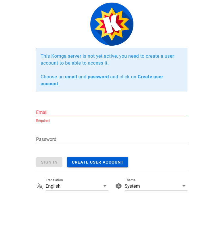 Chờ vài phút để hệ thống khởi động komga, sau đó truy cập vào server: http://<IP-Address>:25600 . Nhập vào email và password, nhấn vào Create user account để tạo tài khoản admin cho Komga.
