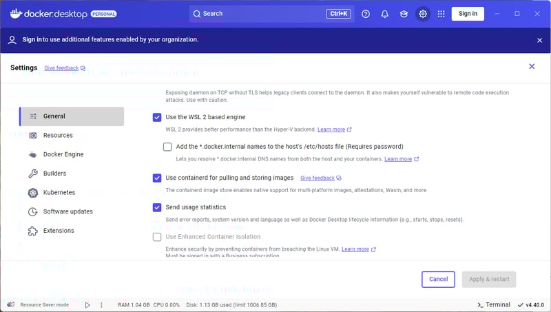 Mở Docker Desktop, vào Settings > General, tick chọn Use the WSL 2 based engine.