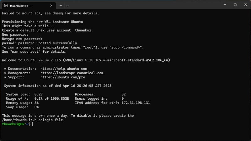 Mở terminal Ubuntu (từ Start Menu hoặc gõ lệnh wsl trong Terminal).