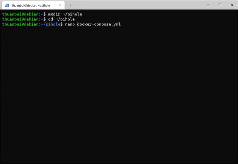mkdir ~/piholecd ~/piholeTạo file docker-compose.yml để cấu hình Pi-hole