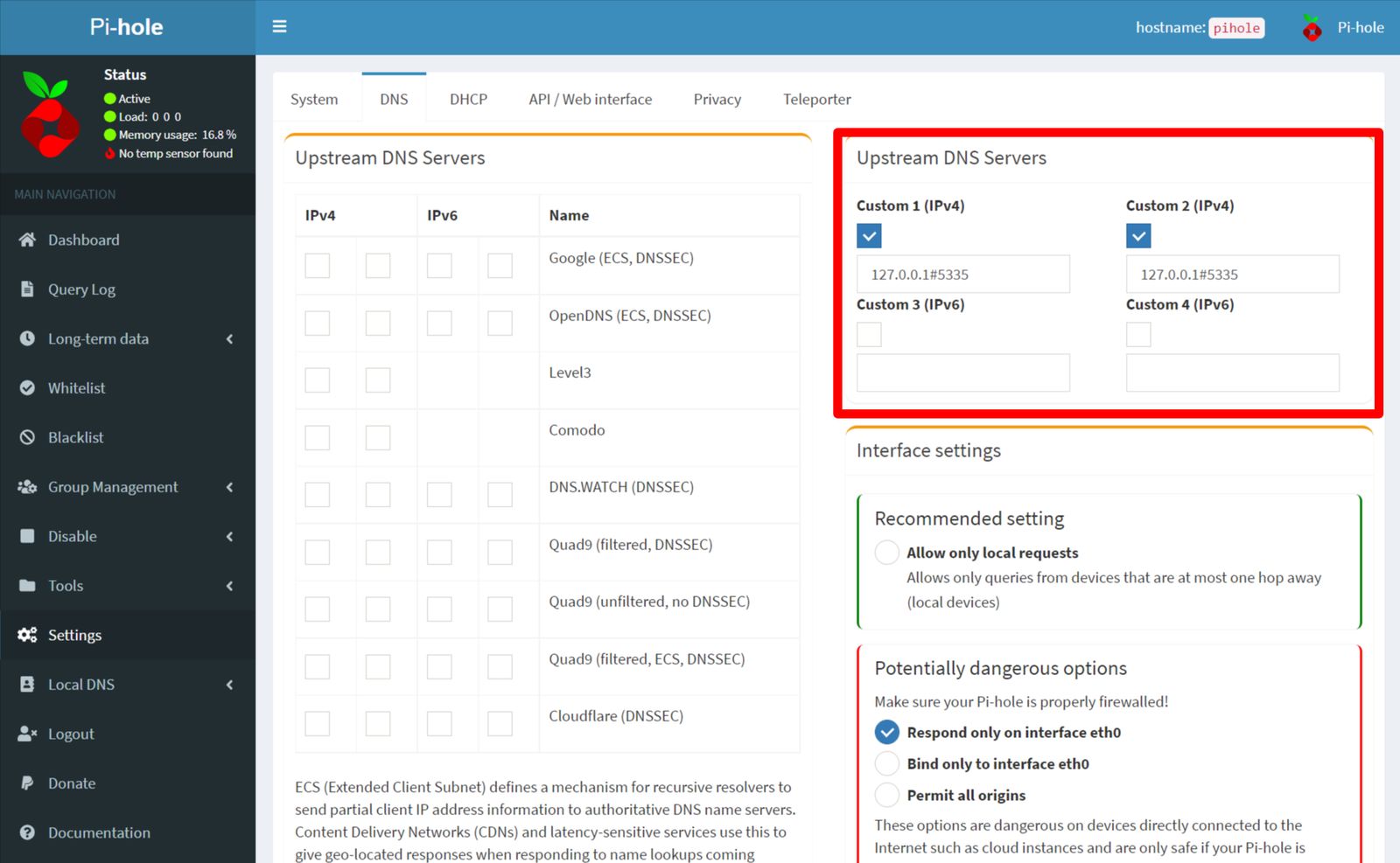 Truy cập vào mục Settings —> DNS, bạn sẽ thấy Pi-hole đã được thiết lập sẵn sử dụng Upstream DNS Server ở địa chỉ localhost 127.0.0.1#5335, chính là địa chỉ IP và port hoạt động của Unbound.