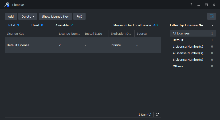 Sau khi cài đặt xong, bạn cần khởi động lại DSM. Sau đó truy cập vào SS, mở app License lên sẽ thấy số lượng license đã tăng lên thành 58.