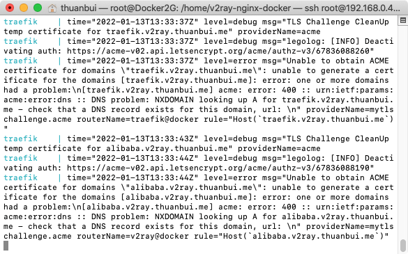 docker-compose upCông cụ ACME tích hợp trong Docker container sẽ tự động kích hoạt chứng chỉ bảo mật SSL của Let’s Encrypt cho 2 tên miền alibaba.v2ray.thuanbui.me và traefik.v2ray.thuanbui.me. Nếu ở bạn bỏ qua bước 4 hoặc cấu hình sai trên Cloudflare, bạn sẽ thấy thong báo lỗi Unbale to obtain ACME certificate for ...