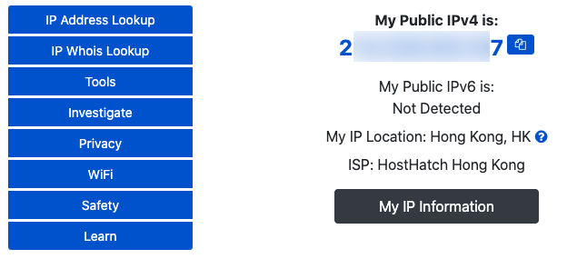 Kiểm tra xem Proxy đã hoạt động ngon chưa: truy cập vào https://www.whatismyip.com/ thấy IP chuyển qua IP của HostHatch Hong Kong.