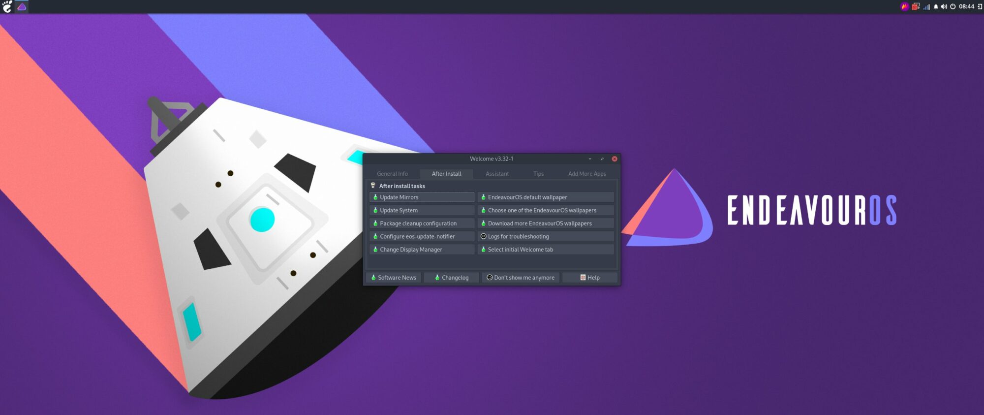Ở lần khởi động đầu tiên, EndeavourOS sẽ hiện cửa sổ Welcome với các lựa chọn tùy chỉnh hệ thống. Bạn có thể bấm vào nút Don’t show me anymore để nó không hiện ra nữa ở những lần khởi động sau.