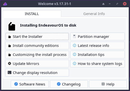 Bấm vào Start Installer để bắt đầu quá trình cài đặt. Hoặc bạn cũng có thể bấm vào Install community editions để cài đặt các phiên bản độ do cộng đồng phát triển (không khuyến khích nếu bạn mới làm quen với Linux).