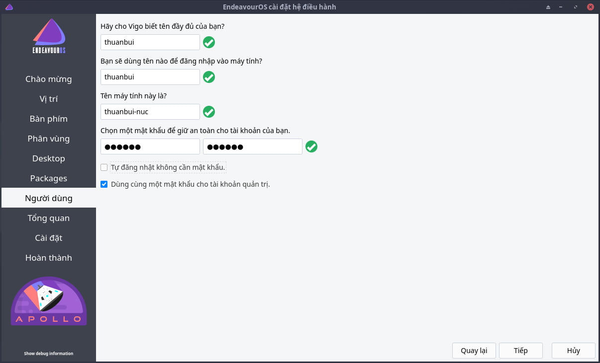 Thiết lập tên người dùng, tên máy tính và mật khẩu