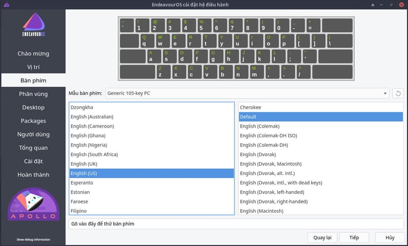 Chọn tiếp mẫu bàn phím: English (US) - Default