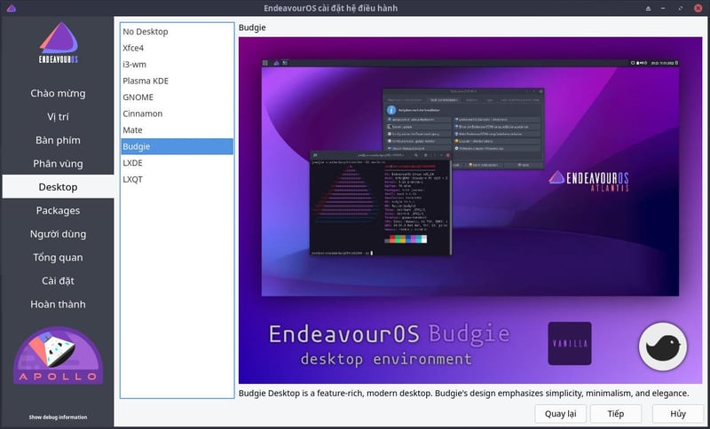 Chọn giao diện Desktop. Nếu mới làm quen với Linux, bạn nên chọn Gnome / Cinnamon / Plasma KDE, 3 anh này có giao diện thân thiện, dễ sử dụng nhất.