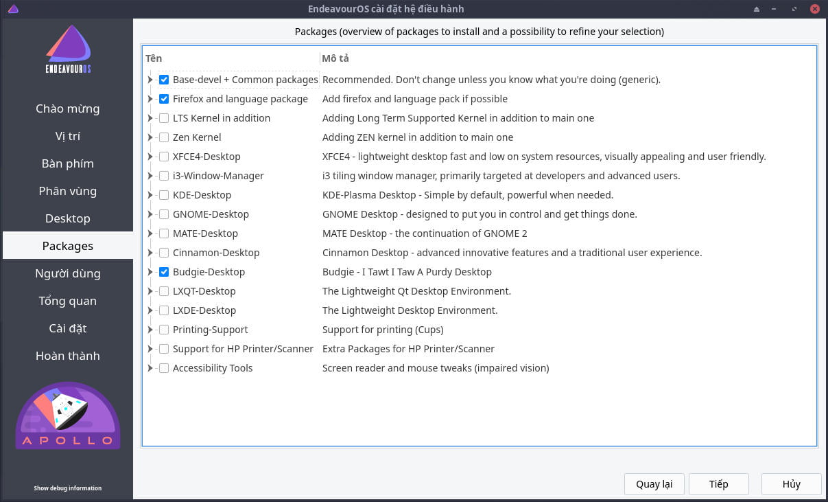 Chọn tiếp các gói phần mềm bạn muốn cài đặt thêm. Có thể chọn cài đặt nhiều giao diện Desktop nếu muốn.