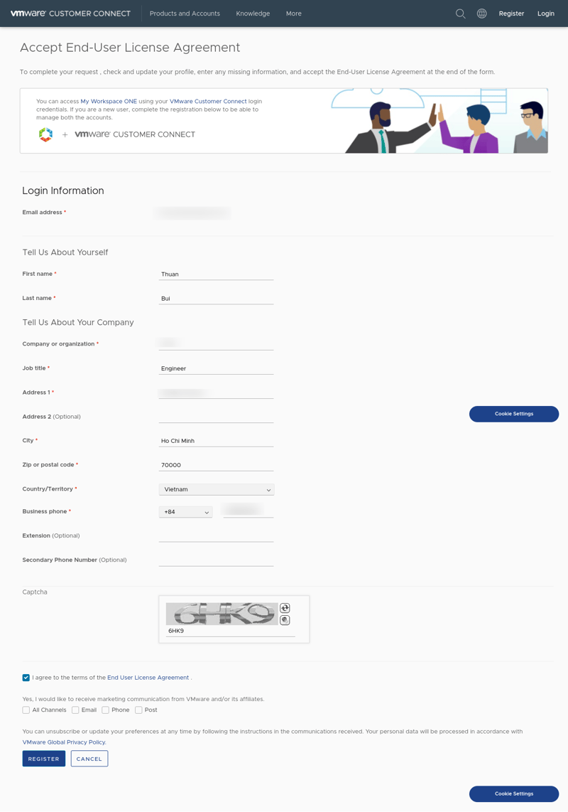 VMWare sẽ yêu cầu bạn đăng nhập (nếu đã có tài khoản) hoặc đăng ký tài khoản (nếu chưa có tài khoản), và sau đó đăng ký sử dụng ESXi thì mới tải về được.