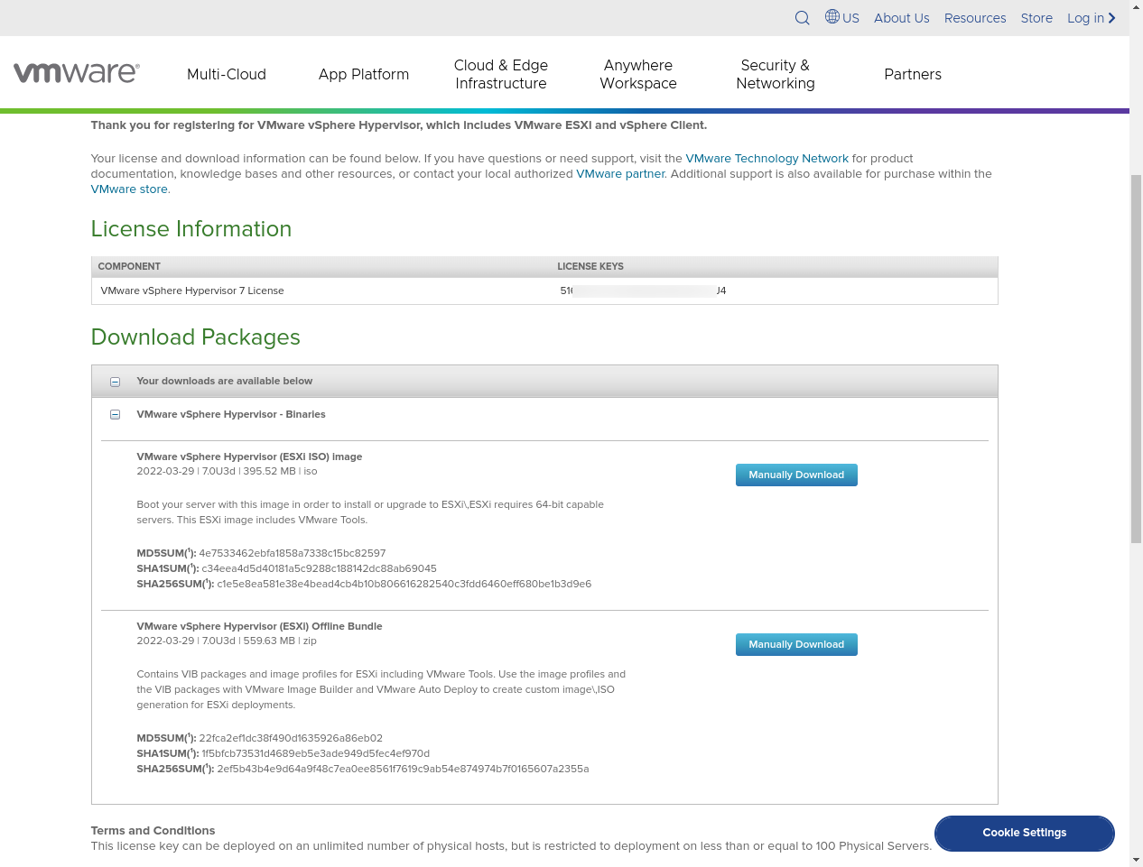 Sau khi đăng ký thành công, bạn sẽ được cung cấp 1 license key. Đồng thời bạn đã có thể tải về file ISO của ESXi 7 về máy.