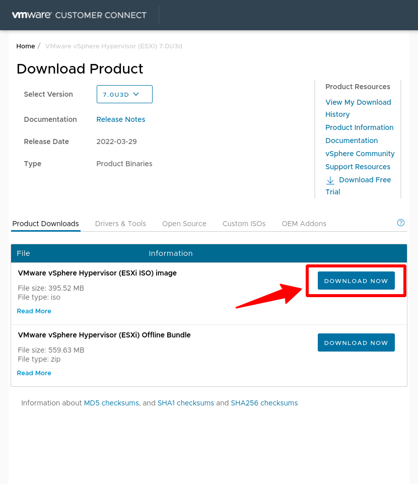 Tải ESXi 7.0u3D trực tiếp từ VMWare theo link này: Download ESXi.