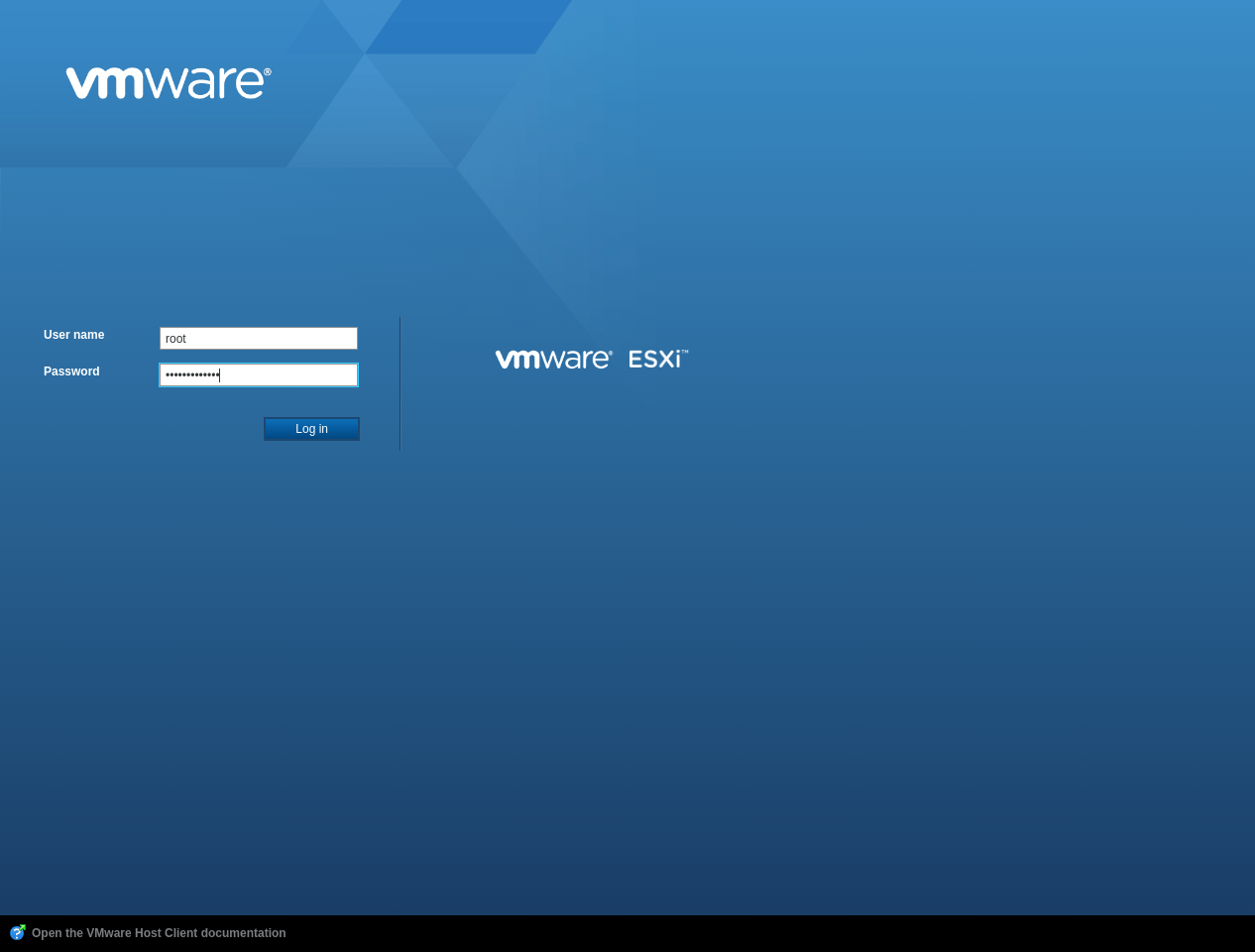 Đăng nhập bằng username root và mật khẩu bạn đã thiết lập khi cài đặt ESXi.