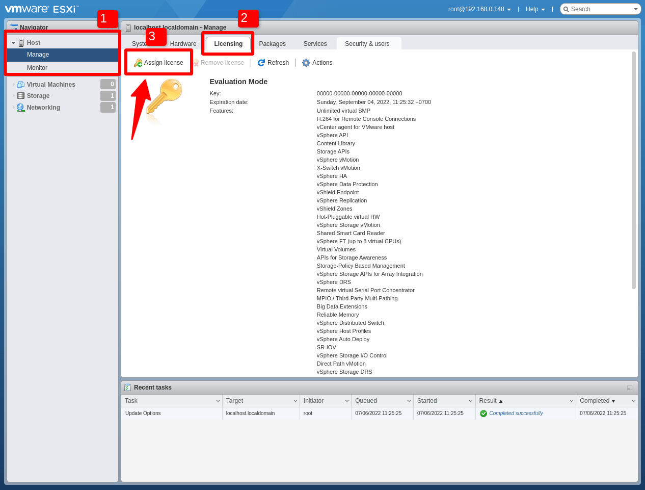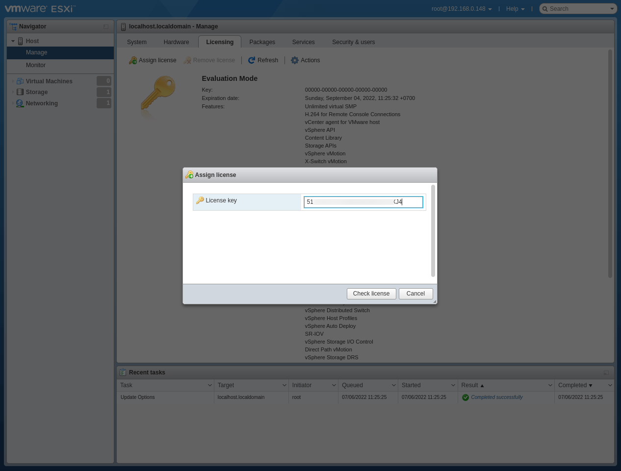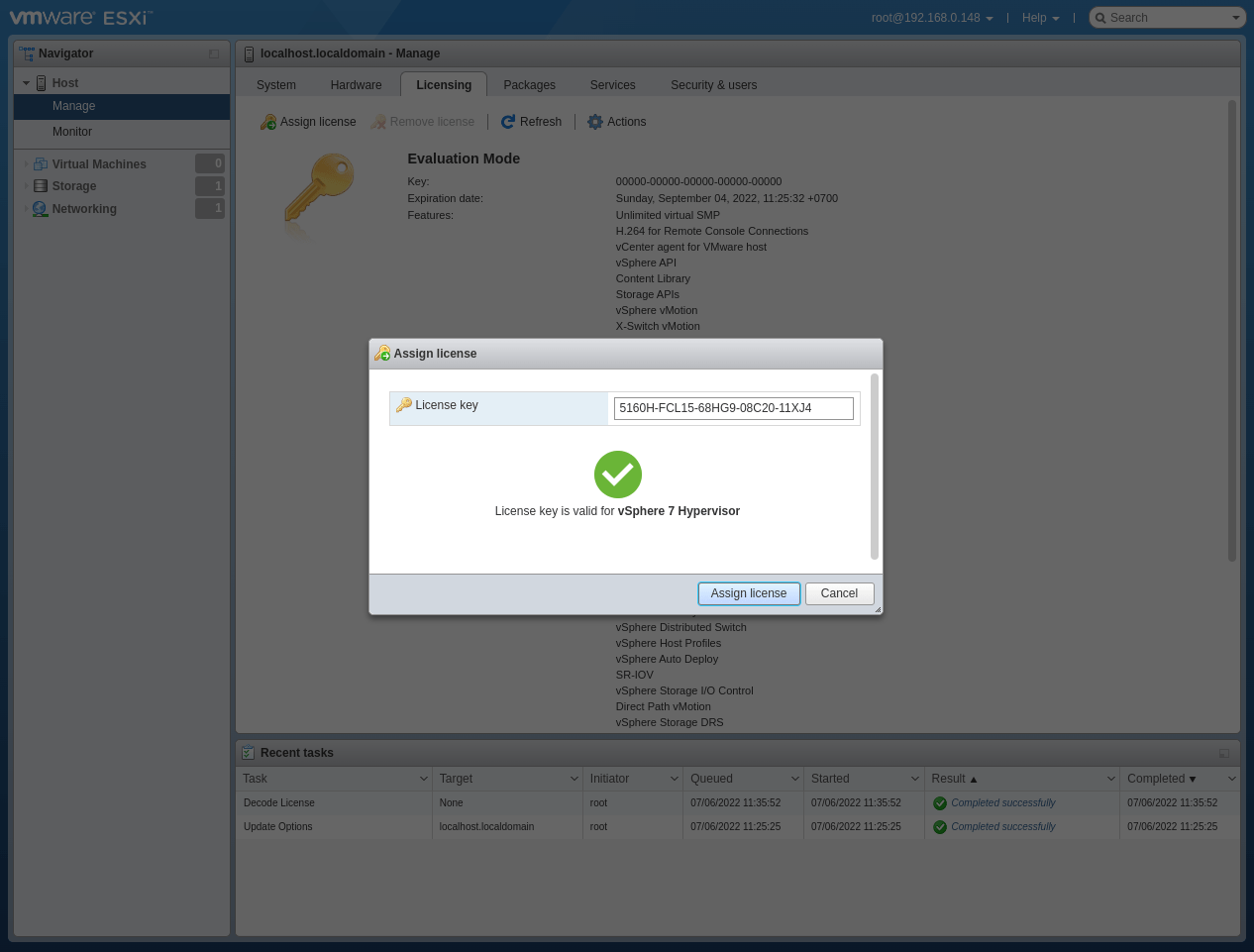 ESXi 7.0 đã được kích hoạt License Key thành công.
