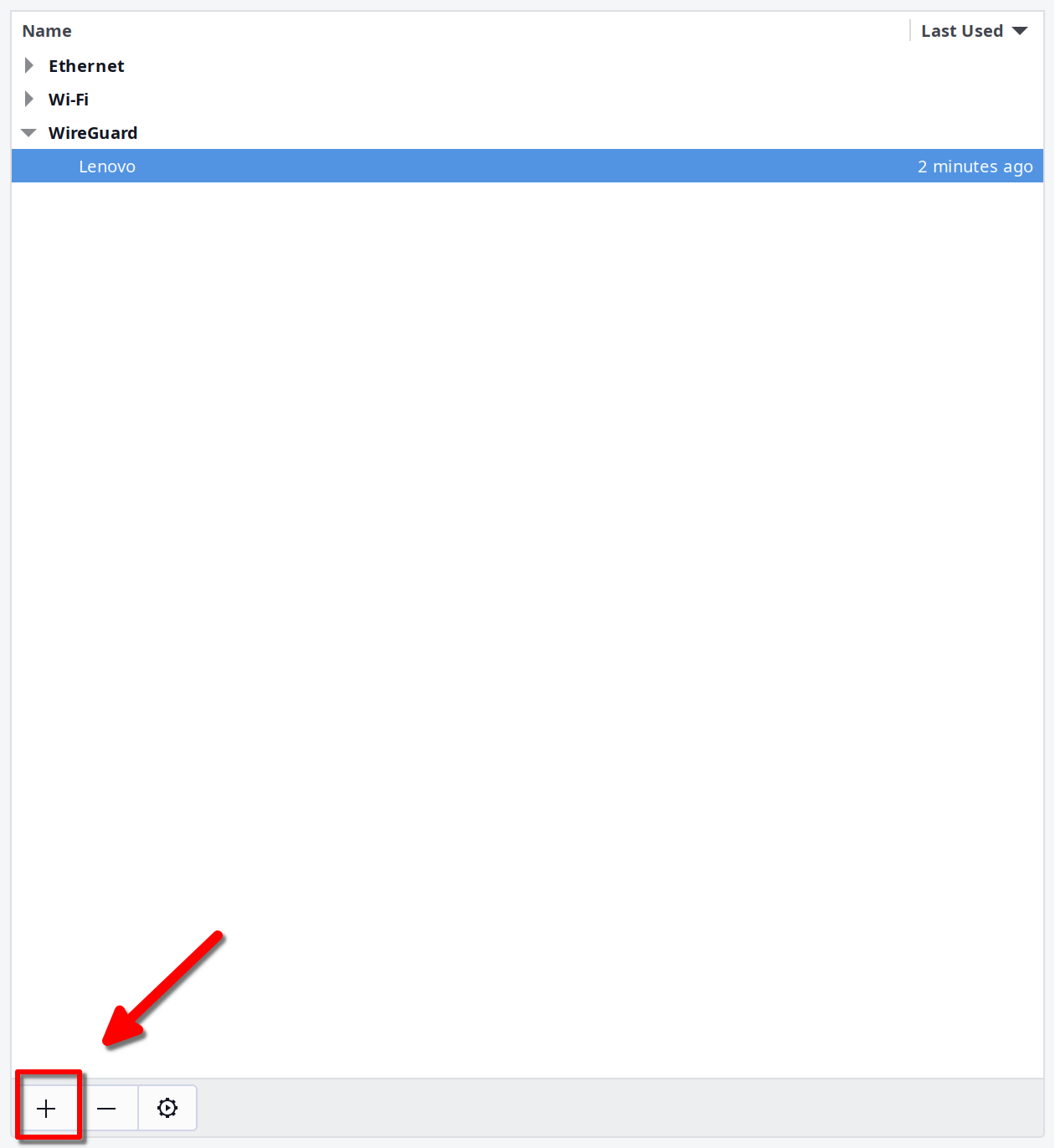 Mở Network Manager và bấm vào dấu + để tạo kết nối mới