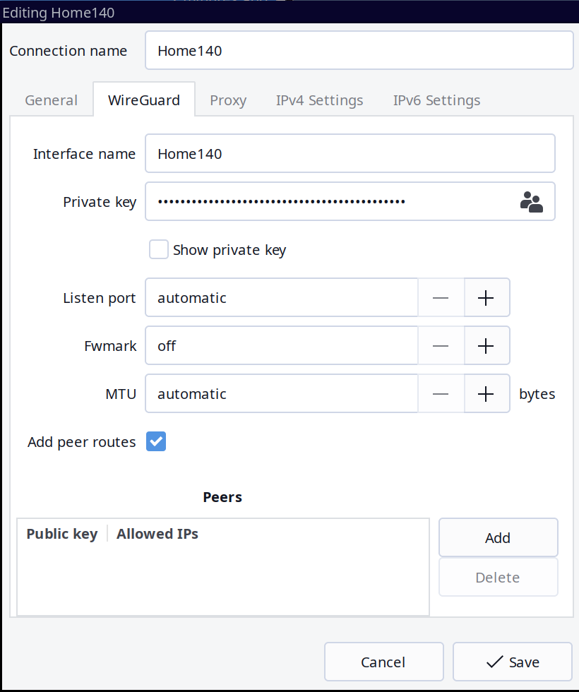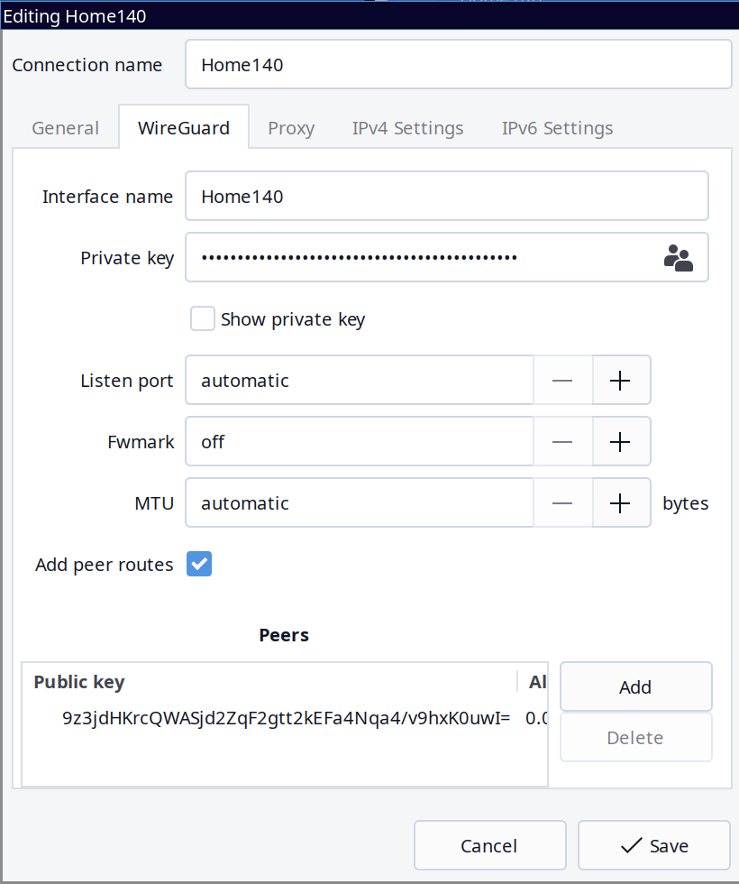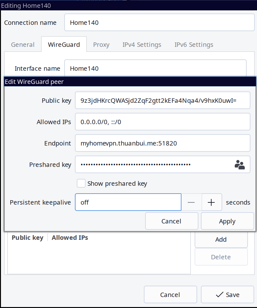 nmcli connection down Home140Thế là xong. Cấu hình WireGuard client tưởng rắc rối nhưng hóa ra dễ ẹc. Thao tác bằng dòng lệnh nhanh gọn, tiện lợi hơn hẳn so với trên Windows hay macOS.