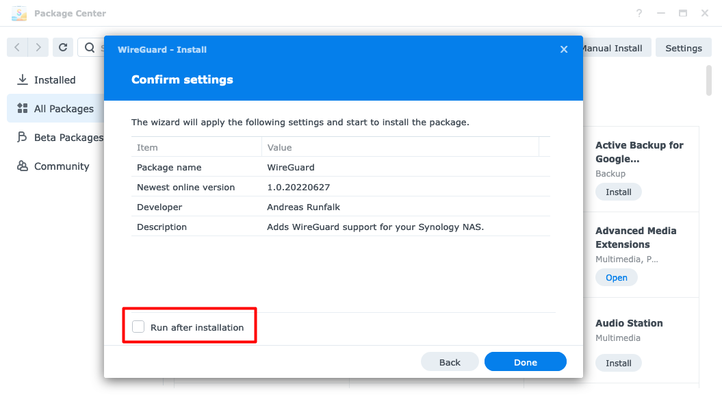 WireGuard has been successfully startedQuay lại DSM, mở Package Center, bạn sẽ thấy WireGuard đang hoạt động.