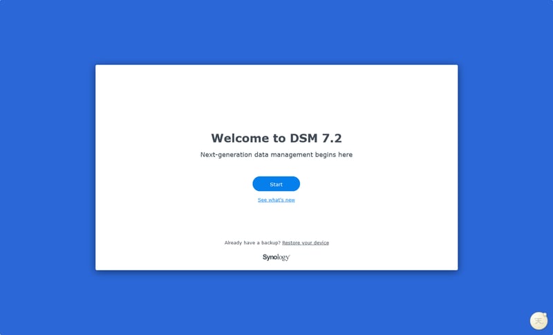 Các bước cài đặt DSM 7.2 thao tác y hệt như DSM 7.1. Sau khi cài đặt xong, bạn sẽ thấy màn hình chào đón Welcome to DSM 7.2 như dưới đây.