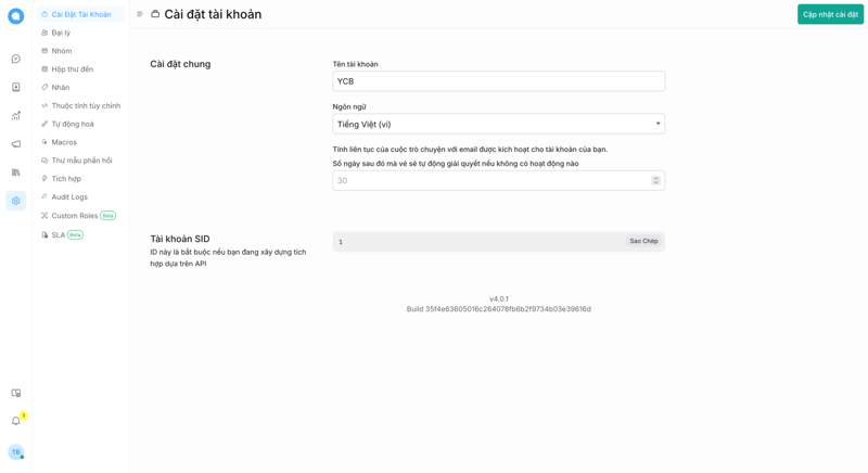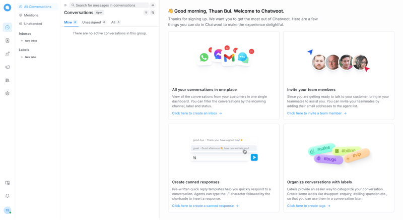 Đây là giao diện chính của Chatwoot sau khi đăng nhập.