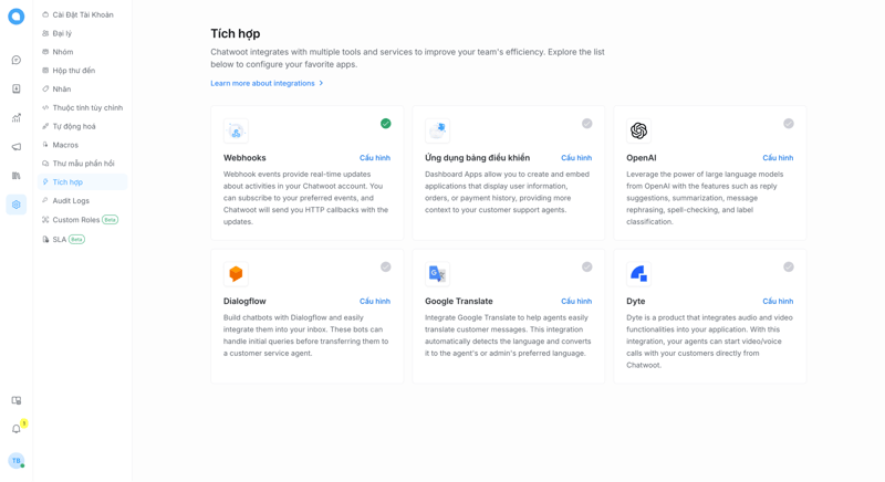 Truy cập vào phần Tích hợp để cấu hình kết nối với các ứng dụng bên ngoài như Webhooks, Google Translate, OpenAI,…