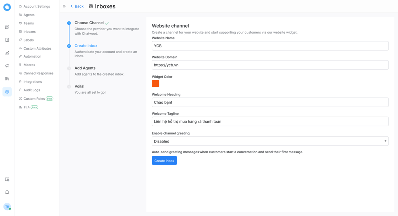 Để cấu hình kênh giao tiếp, truy cập vào 1. Settings —> 2. Inboxes —> 3. Add inbox