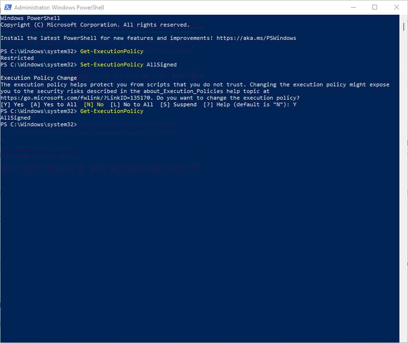 Set-ExecutionPolicy AllSignedGõ lại lệnh Get-ExecutionPolicy sẽ thấy kết quả là AllSigned.