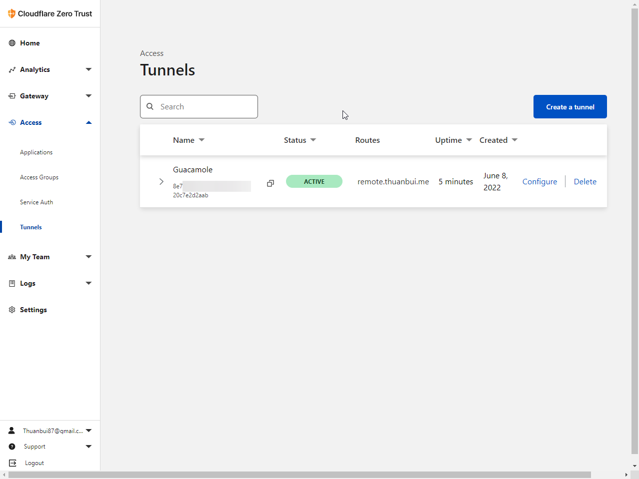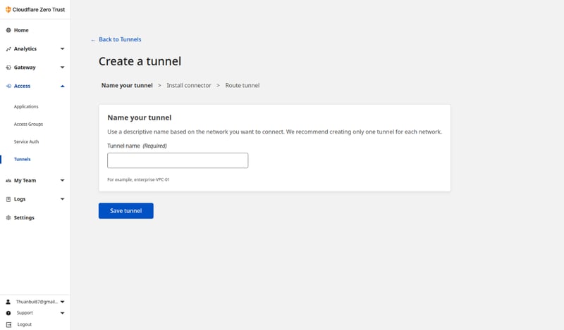 Sau khi thiết lập thành công, bạn truy cập vào Tunnels (nằm trong mục Access) ở menu bên trái. Bấm vào Create a tunnel để tạo kết nối.