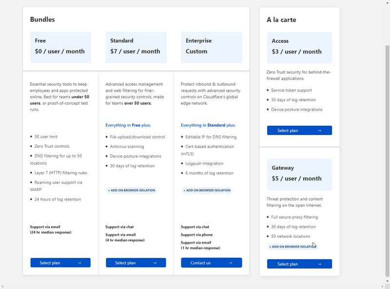 Dịch vụ Zero Trust của Cloudflare có nhiều mức giá khác nhau. Với nhu cầu sử dụng cá nhân. gói Free miễn phí là đủ dùng. Bấm vào Select Plan trong mục Free ($0 / user / month)