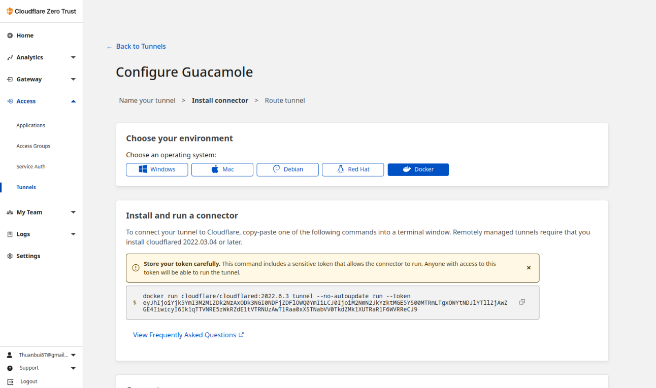 Ở bước tiếp theo, bạn sẽ cần cài đặt công cụ cloudflared lên máy chủ nằm trong mạng nội bộ. Mình chọn cách cài đặt bằng Docker cho nhanh gọn.