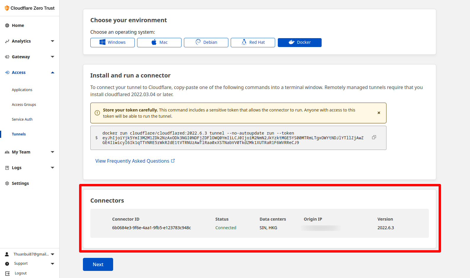 docker run -d --restart always cloudflare/cloudflared:2022.6.3 tunnel --no-autoupdate run --token eyJhIjoiYjk5YmI3M2M1ZDk2NzAxODk3NGI0NDFjZDFlOWQ0YmIiLCJ0IjoiM2NmN2JkYzktMGE5YS00MTRmLTgxOWYtNDJlYTllZjAwZGE4IiwicyI6Ill6azFaamczT1dZdE9XRm1ZUzAwWW1Ka0xUbG1PRE10TUdZNE9HRXhZemd3WlCCSSDAS9Sau khi chạy trên máy chủ xong, quay lại trình duyệt, bạn sẽ thấy mục Connectors hiện ra thông báo đã kết nối thành công. Mục Origin IP sẽ hiện ra địa chỉ IP của mạng ở nhà. Bấm Next để tiếp tục.