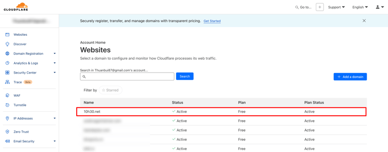 Sau khi đăng nhập, bạn sẽ thấy danh sách các tên miền đã thêm vào Cloudflare. Bấm chọn vào tên miền bạn muốn tìm Zone ID