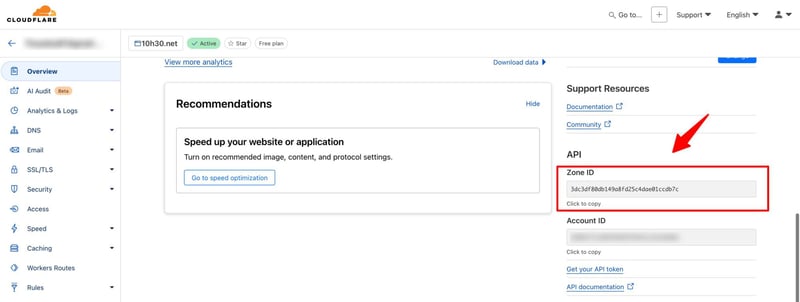 Sau khi vào trang quản lý của tên miền, kéo xuống dưới cùng của trang Overview, phía cột bên phải bạn sẽ thấy mục Zone ID nằm trong phần API.