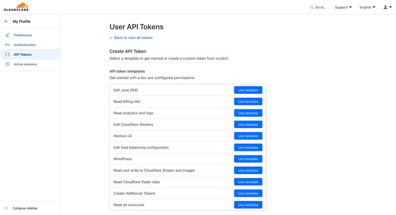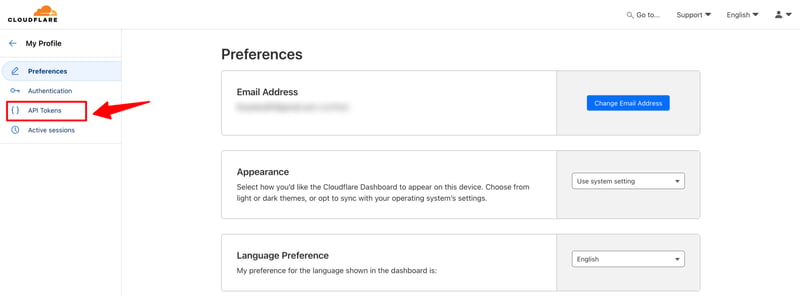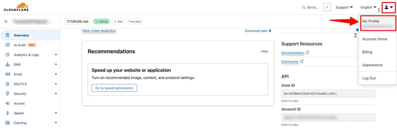 Truy cập vào https://dash.cloudflare.com/profile/api-tokens để vào trang quản lý API Tokens. Hoặc từ trang chủ Cloudflare, bấm vào biểu tượng Tài khoản rồi chọn My Profile