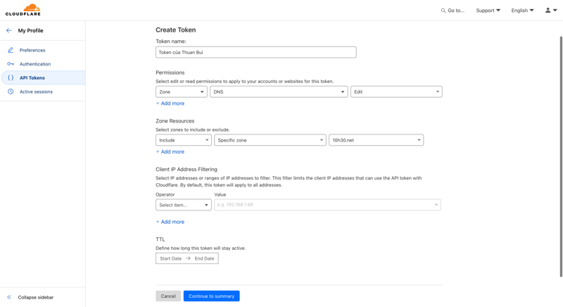 Chọn cụ thể tên miền (hoặc tất cả tên miền) mà API Token này sẽ được phép truy cập.