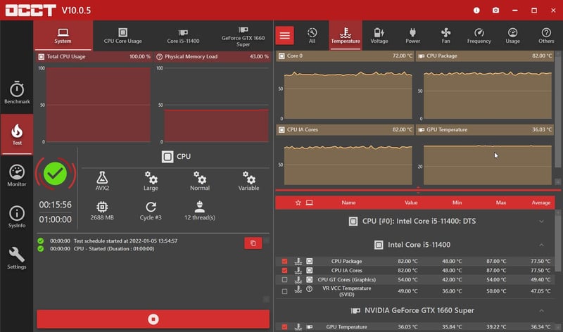 Mình dùng thử OCCT để stress CPU trong 15’ để kiểm tra nhiệt độ. Nhiệt độ CPU có lúc lên đến 87C, nhưng trung bình giữ dưới 80C. Đưa tay ra phía sau case có thể cảm nhận hơi nóng thổi ra, nhưng toàn bộ thùng máy vẫn hoạt động êm ái, không có bất kỳ tiếng quạt gào rú nào phát ra.