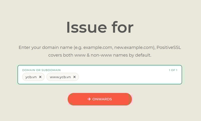 Nhập vào tên miền cần dùng chứng chỉ SSL này. Mình nhập vào website ycb.vn
