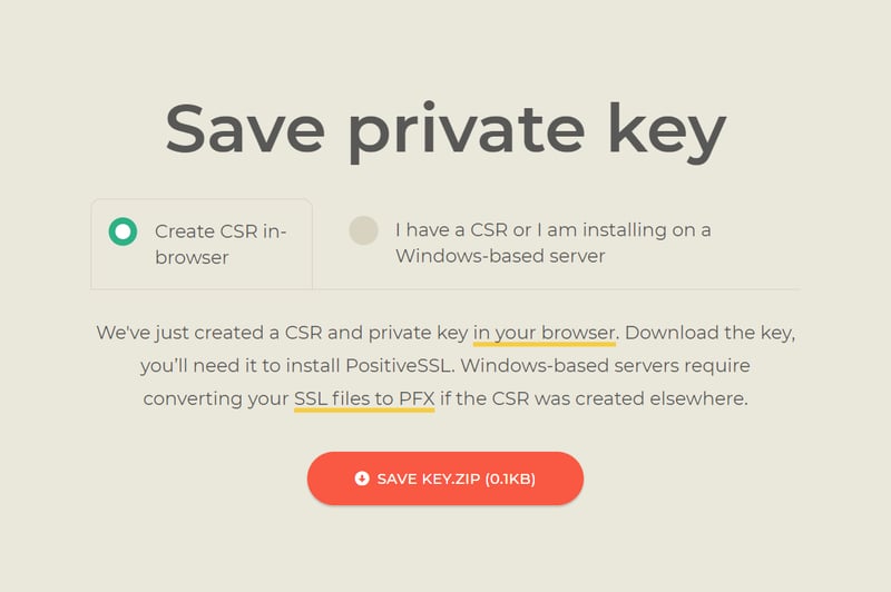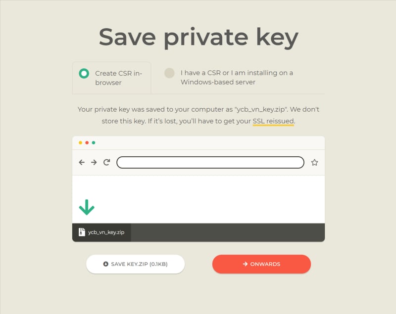 Chọn Create CSR in-browser và bấm nút SAVE KEY.ZIP để lưu Private key về máy