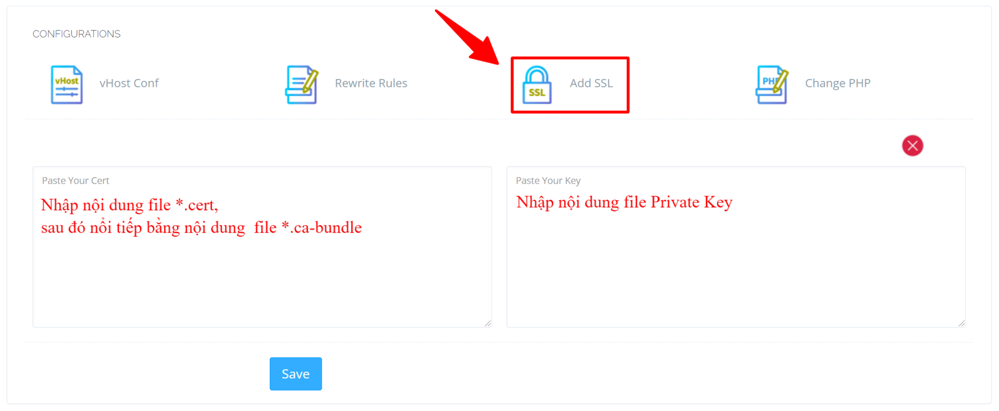 -----BEGIN PRIVATE KEY-----aaaaaaabbbbbbbcccccc-----END PRIVATE KEY-----Sau khi hoàn tất bấm Save.