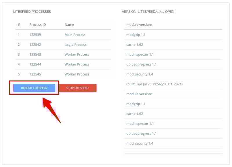 Tiếp theo truy cập vào mục LiteSpeed Status nằm trong menu Server Status ở cột bên trái. Bấm vào nút Reboot LiteSpeed để khởi động lại LiteSpeed Server.