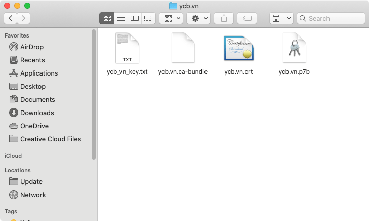 Ngoài ra chúng ta còn có 1 file chứa Private Key đã tải về ở bước trước đó với tên gọi ycb_vn_key.txt. Tổng cộng sẽ có 4 file chứa thông tin của chứng chỉ SSL như dưới đây.